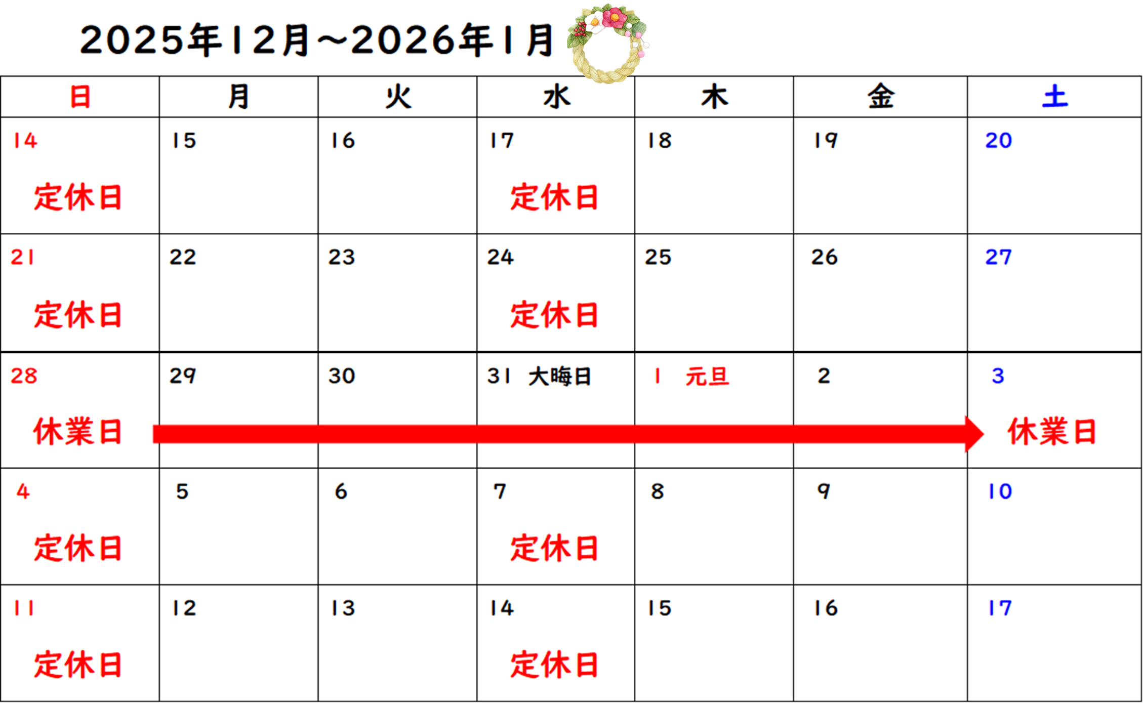 年末年始休業とさせていただきます